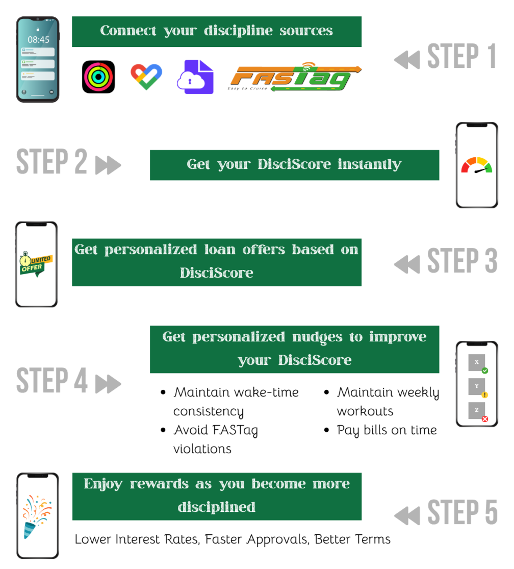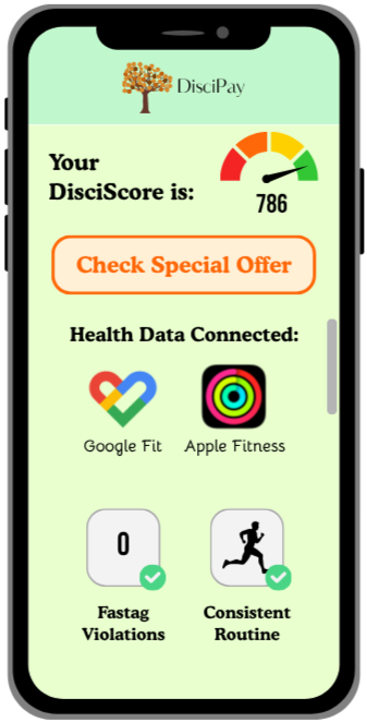 Most of us are way more disciplined in real life than our credit score makes it look. You wake up on time, get your steps in, hit your workouts, follow traffic rules, keep your phone clean, pay your bills before they’re due. But, none of that actually counts anywhere. At least not with traditional lenders.That’s exactly why we built DisciPay.Instead of judging you only by your credit history, DisciPay looks at the discipline you already have in your daily life.
